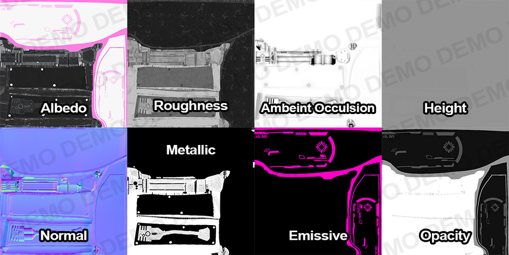 - Albedo, Normal, Roughness, Metallic, Ambient Occlusion, Emissive, Height, Opacity textures